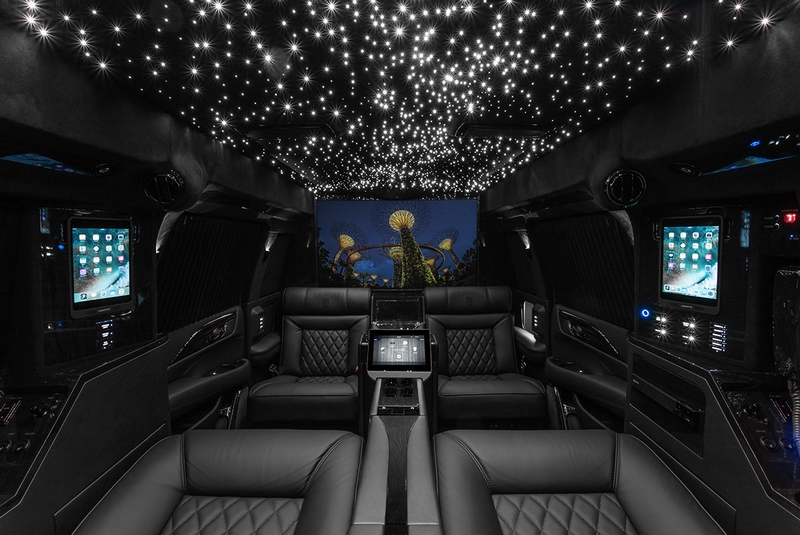 Discover the world’s most prestigious gatherings & exhibitionsThe Cadillac Escalade Viceroy comes equipped with multiple Apple iPad Pros integrated throughout the cabin via magnetic charging docks, diamond-stitched European leather power seats, a Control4 touch screen management system, airline style tables, security system, a raised ceiling with ambient LED and vivid star-liner lighting, a Mac Mini, upgraded air conditioning, and video conferencing.