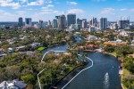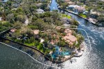The private Mediterranean-style property situated on 1.41 acres, offering 270-degree river and skyline views, tropical landscaping, and a resort-style pool overlooking the New River with a three-story gazebo with clocktower and curved staircase.
