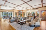 The 10-bedroom, five-building compound features cathedral ceilings, custom ironwork and finishes, and floor-to-ceiling windows with river and peninsula water views; a grand foyer with a crystal chandelier; a kitchen with a wood-burning pizza oven and a separate caterer’s kitchen; a French-inspired glass conservatory; a master suite with a lounging area; a guest apartment; and an elevator, gym, workshop, theater, billiards room, staff office, and multiple safe rooms.