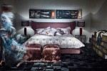 The use of precious materials such as marble, onyx or refined leathers, the 50- 60s references in the shape of furniture and the original combination of bright colours and iridescent shades are peculiarities which characterize the settings: a dining room, a living room, a bedroom and a break-room. The result is a mix with a strong scenographic effect and with an unmistakable urban- glam appeal, a perfect representation of Roberto Cavalli Home Interiors style