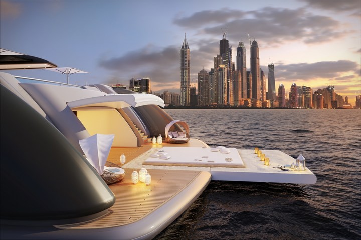 Discover the world’s most prestigious gatherings & exhibitionsA waterfall from the upper deck cascades down into the main deck swimming pool. And the main deck is party central, featuring a stunning pool bar, opening balconies and large entertainment areas. The upper deck has an outstanding owner’s apartment with a private plunge pool and open-air aft deck dining for 20+ people.