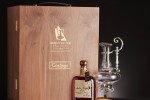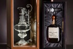 The leather-lined, polished wooden chest was crafted by Moran’s Wood Components in England. It features a pull-out drawer for the rum bottle and book, and an etched glass door that showcases the decanter itself.