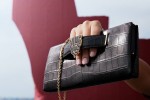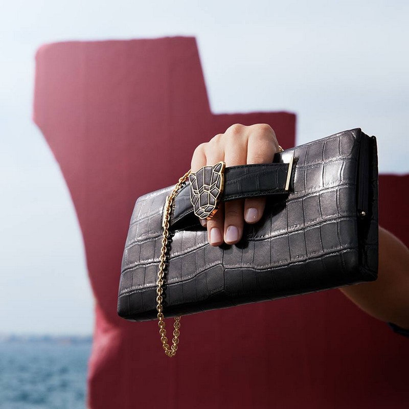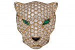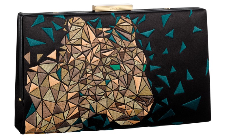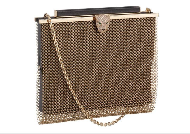 new collection features five models in black calfskin, black satin, bronze goatskin, black crocodile. The most expensive item is the yellow gold, diamonds, emeralds, onyx and black calfskin $186,000 bag. The Panther head motif may be transformed into a brooch.
