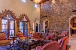 Villa Falcone features a castle-like great room with natural stone walls, a fluted tortoise-shell chandelier, and a carved limestone mantel and fireplace. Four elegant Juliette balconies overlook the extensive sitting area beneath the soaring tongue and groove wood ceiling with 20-inch hand-hewed beams. French doors lead out to the main patio and pool deck. Two stunning pools offer formal or fun swimming, a jetted spa, a waterslide, a water wall feature, and even a hidden grotto behind a waterfall. Combined with the swim-up barstools and lush grounds, this oasis in the desert is perfect for entertaining.