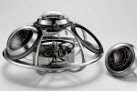 This intergalactic horological weather station from MB&F + L’Epée 1839 combines UFO elements. A clock, a barometer, a hygrometer, and a thermometer are integrated into a mothership called The Fifth Element. The apparently anachronistic weather station is an entity much larger than the sum of its 500 parts.