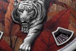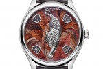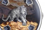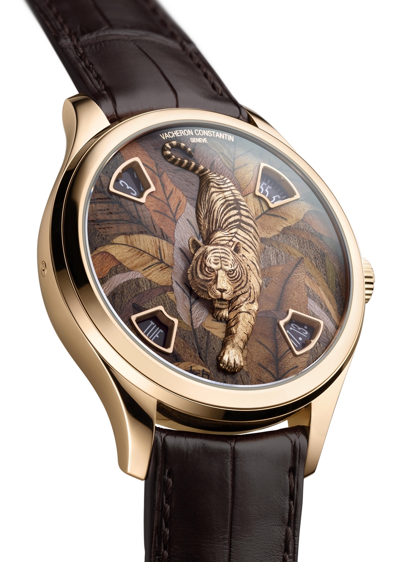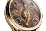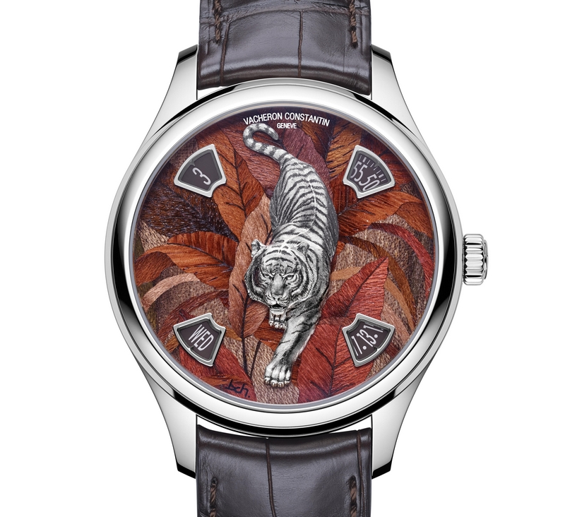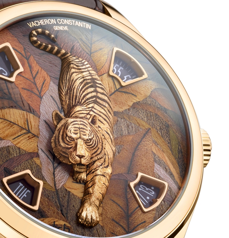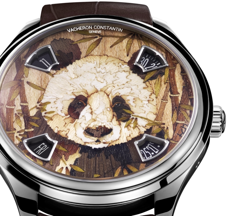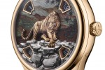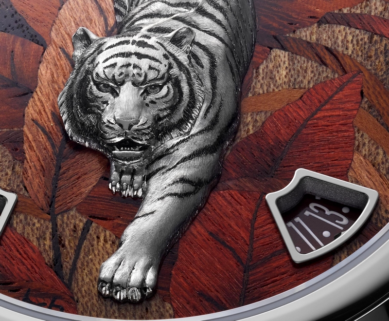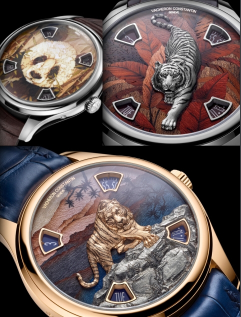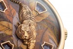 Engraving and wood marquetry give life to Vacheron Constantin Les Cabinotiers Imperial Tiger, Les Cabinotiers Majestic Tiger, and Les Cabinotiers Wild Panda. Les Cabinotiers Imperial Tiger and Majestic Tiger models highlight the association between bas-relief engraving (for the tigers and rocks) and wood marquetry (the background landscape and foliage). Les Cabinotiers Wild Panda watches are crafted in wood marquetry.