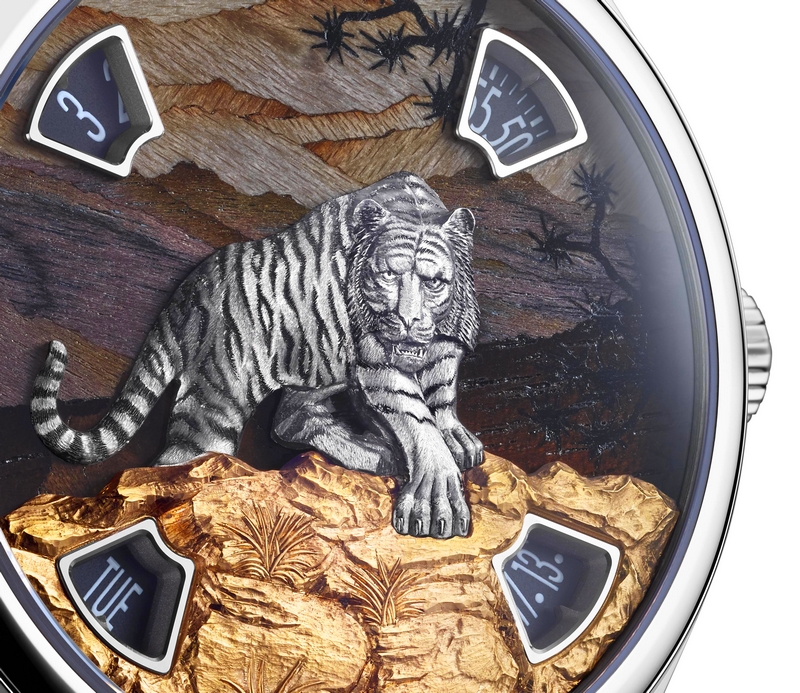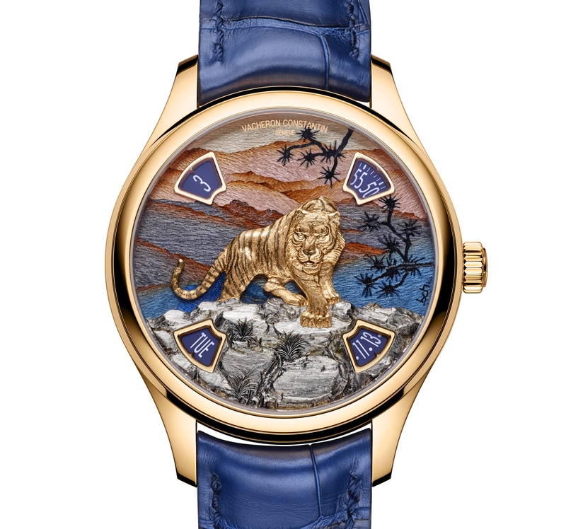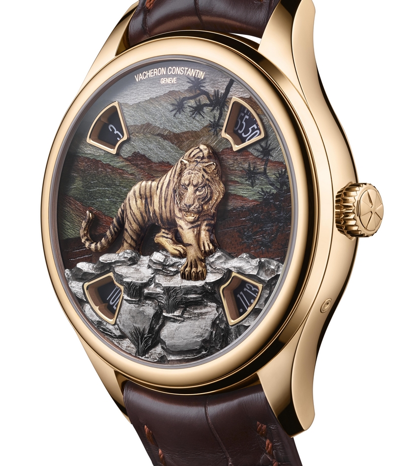 A kind of “trompe l’oeil” effect makes it seem as if the tigers are on the move, striding through the jungle or ready to leap from high rocks. With extreme precision, the master engraver plays with various surface finishes, subtly alternating between matt, polished, satin-brushed and chased techniques to create contrasts that will bring the animals to life, or else using black oxidation as a means of accentuating the tigers’ stripes. This extreme attention lavished on finishing is a Vacheron Constantin signature. Recreating the tigers involves no less than 60 hours, says the luxury watch manufacture.