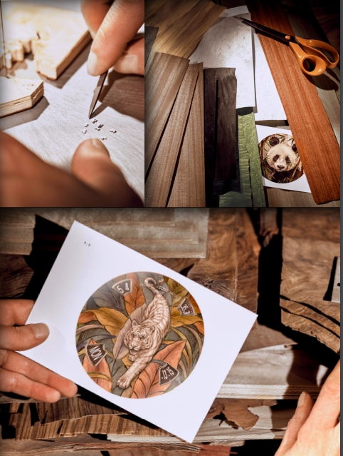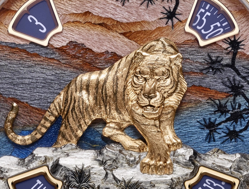 The marquetry (inlay) technique serves to compose the motif using a multitude of tiny, individually hand-cut wood veneers in various shades and shapes. More than 200 pieces have been assembled to form the rocky backdrop of the ‘imperial’ tigers; about 130 pieces for the foliage surrounding the ‘majestic tigers’; and more than 300 for the pandas. Five to twenty types of wood were used for each of the dials, depending on the complexity of the decorations.