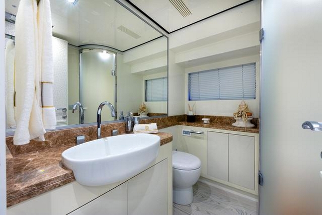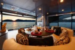 To ensure privacy, the owner’s suite is accessed by a staircase from the main salon that also serves as a private lounge when there are no guests on board. And to provide close contact with the sea the aft deck cockpit is much lower than normal, functioning as a continuous outside space with sliding glass doors on three sides. Lowering the deck height was quite an engineering challenge as the engine room three is directly underneath.