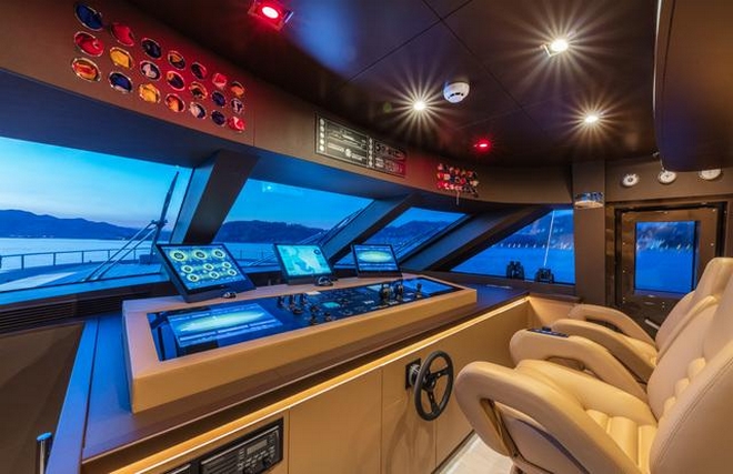 Cavalli further specified that his own suite should be on a raised level behind the pilothouse – a first on a yacht of this size – with all-round sea views and natural ventilation. This meant devising a split-level layout whereby the main salon is on the main deck aft with the owner’s suite just four steps up on the same level as the pilothouse.