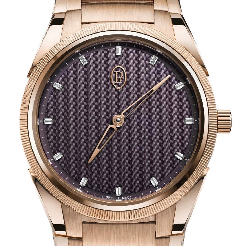 Slightly reduced in size, the new Parmigiani Fleurier Tonda PF Automatic 36mm timepiece for ladies retains the attributes of the watch model that has become a signature of the luxury watchmaking brand: the Tonda PF Micro-Rotor. Equipped with a new, in-house automatic movement of subtly smaller dimensions, the Tonda PF Automatic 36mm introduces itself in a format suitable for a thinner wrist. The watch obviously upholds all the stylistic codes specific to Parmigiani Fleurier: fluid and harmonious integration of the 18-carat rose gold case and bracelet, knurled bezel, finely guilloché minimalist dial with invisible set baguette-cut diamond indexes. It is a timepiece of austere sobriety and discreet elegance.
