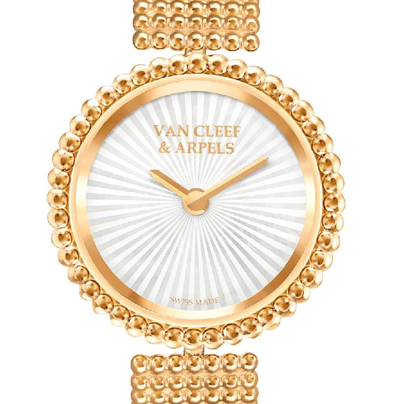This timeless piece showcases the emblematic gold bead motif, faithful to the tradition of Van Cleef & Arpels. This watch combines gentle curves and subtle details, watchmaking savoir-faire and jewelry inspiration. With its fluid lines and playful spirit, it offers a contemporary take on jewels that tell time. Elegant and feminine, the watch has a round shape fringed with a very modern-looking double row of golden beads, displaying an edge in mirror-polished yellow gold. Beneath a convex glass, a radiating guilloché dial catches the light to create intense reflections.