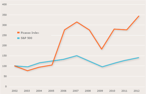 Pablo Picasso was one of the top-ranked artists of 2012, with over 2,700 lots selling in 2012 for nearly US$335 million. Picasso’s demand has remained consistently high in recent years, with an overall sell-through rate in 2012 above 75%. Validating the strength of art as an alternative asset, many Modern and Contemporary artists have shown stronger returns than financial markets over the last decade; as demonstrated in the graph above, Picasso has outperformed the S&P 500 since 2005, with a robust rebound after the crash.
