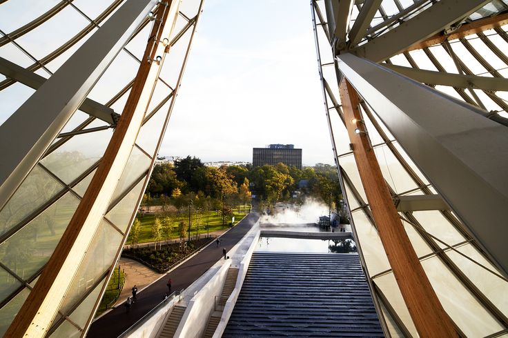 Architect Frank Gehry has designed “a building that, through its strength and singularity, represents the first artistic step on the part of the Fondation Louis Vuitton“. This large vessel covered in twelve glass sails, set on a water garden created for the occasion, blends into the natural environment, amidst the wood and the garden, playing with light and mirror effects.”