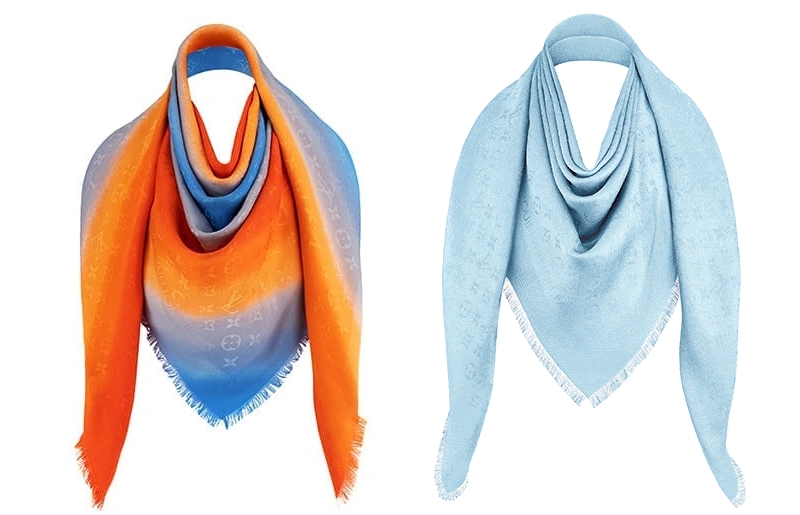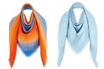 Featuring Printemps colours (orange and blue), all eyes are on the Monogram shawl design from the Tie-Dye collection (Wool and silk Shawl, 595 €) with graduated sunset-effect shades.