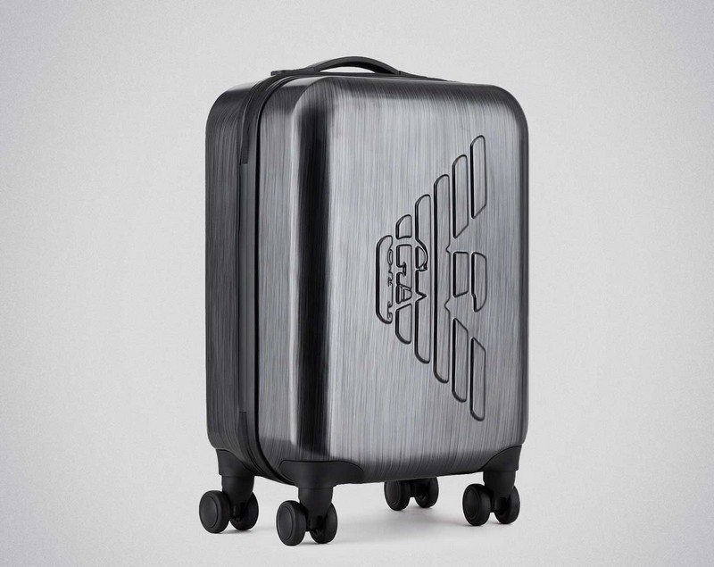 Check-in, take-off, jet-lag.  Travel in style with the new Emporio Armani trolley bag, made from sturdy, lightweight material and boasting characteristics that guarantee practicality and security, such as the telescoping handle and TSA lock.