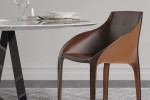 The silhouette of the Brizia chair is characterised by clear and essential shapes. This sophisticated but simple chair is the result of an innovative and skilful project. It is suitable both for the dining area and the office. It is presented with a padded steel frame completely upholstered by a single hide coat in the shades of Brandy.