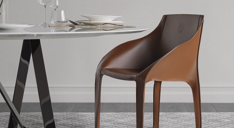 The silhouette of the Brizia chair is characterised by clear and essential shapes. This sophisticated but simple chair is the result of an innovative and skilful project. It is suitable both for the dining area and the office. It is presented with a padded steel frame completely upholstered by a single hide coat in the shades of Brandy.