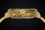 At first glance, the dial captivates with its unique black lacquered canvas, providing a striking contrast to the rich, sunken gold registers. Adorning the dial is the elegantly inscribed “Prince Chronograph,” a nod to Tudor’s prestigious lineage. The hands and hour markers, bathed in 18K yellow gold, exude a warm, radiant glow, perfectly complementing the luxurious exterior.