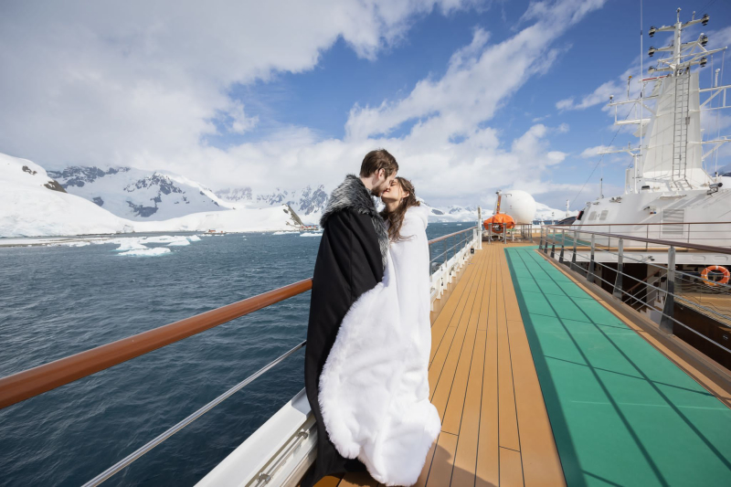 February is the month of love, and for the first time, betrothed couples were legally joined in matrimony on the Seventh Continent. On February 18, 2022, Atlas Ocean Voyages performed the first official wedding on Antarctica. Bride Courtnie Dodson and Groom Brody Vermillion exchanged vows on Danko Island during a 15-minute ceremony, officiated by British Antarctic Territory-registered Marriage Officer Bryan Clark and witnessed by eight additional guests. Throughout World Navigator’s nine-night Antarctica expedition, which departed February 14, Atlas performed four extraordinary weddings and three vow renewals in four days. Known as Happy Ever Atlas, the destination wedding package was complimentary for guests who registered in advance.