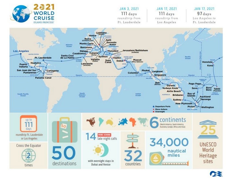The 2021 111-day World Cruise aboard Island Princess starts at $19,999/person. Guests booking the 97- or 111-day World Cruise before November 30, 2019 receive early booking perks such as a $1,000 onboard spending money, free airfare, stateroom upgrade, gratuities, Wi-Fi, specialty dining and wine.