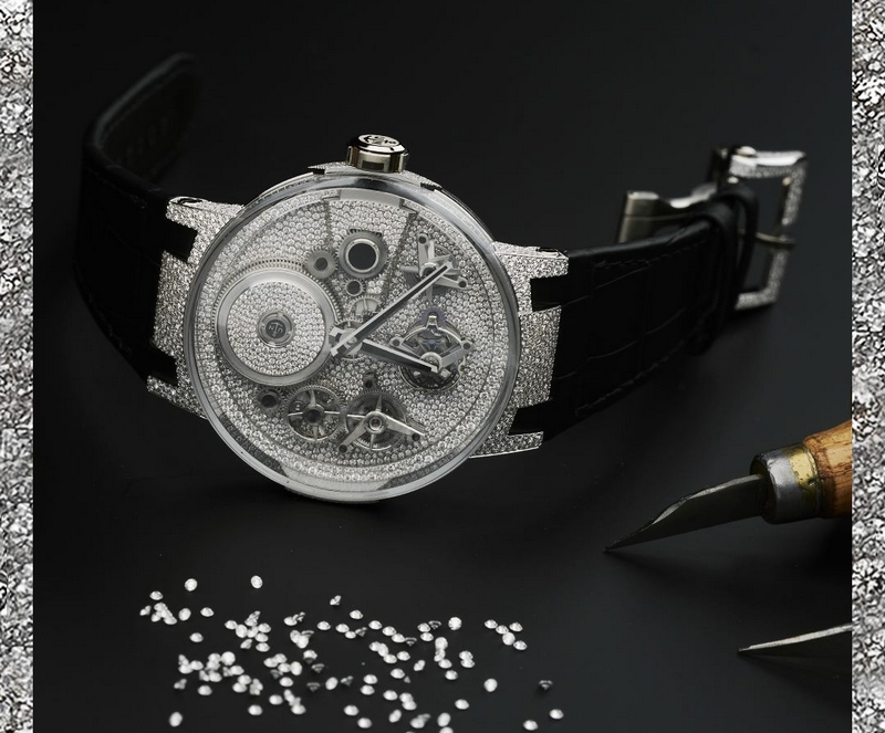 The “snow-setting” art of the new Ulysse Nardin Sparkling Free Wheel. It takes approximately 120 hours of meticulous work to place the 2’251 diamonds side by side and completely cover the surface.