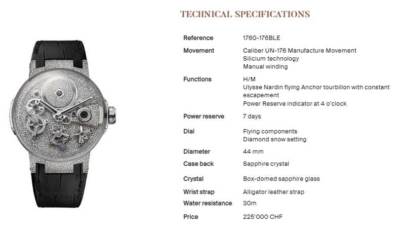Its flying tourbillon is the“Ulysse Anchor Escapement”, a pioneering technology that replaces the traditional Swiss lever escapement system and uses Ulysse Nardin’s signature low friction silicium instead of metal or synthetic rubies.The eight pieces in this Sparkling Free Wheel limited edition are available for 225’000 CHF each (240 813 USD).