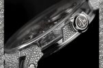 diamond setting alone takes approximately 120 hours of meticulous work to complete. The stellar quality – all VVS or VS with an F/G rating for purity and color – is visible to the naked eye. Diamonds are everywhere on this model, from the face of the gray gold dial to the horns and even the barrel cover. The carbon soft-touch, black alligator band features a clasp also set with diamonds using the snow setting technique.
