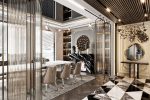 As soon as you step inside this majestic villa, you’ll set foot on the entryway which instantly makes you aware of how harmoniously embedded is Nada Shehab‘s style with Boca do Lobo & LUXXU‘s masterpieces. The use of a patterned marble floor alongside wood slabs on the ceiling paints a beautiful and comfortable atmosphere so you can instantly relax as soon as you arrive with all stresses from the day.