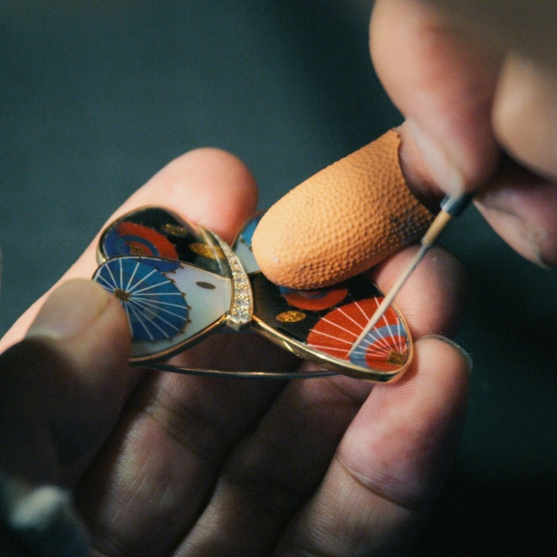 Van Cleef & Arperls’ School of Jewelry Arts has even a new course dedicated to Japanese Urushi Lacquer. At the jeweler’s bench, the students work with metal & vegetable ivory to create motifs on a butterfly jewel. In the lacquer workshop, using tools and materials from far away, the participants create their own lacquered butterfly, praticing three of the lacquer master’s ancestral techniques: placing colors, Maki-e, mosaics in mother of pearl.