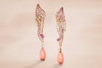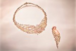 The Flamant corail set from the “Seven Seas” High Jewelry collection pays tribute to the elegance of the pink flamingo. Pink gold, round and pear-shaped diamonds, round and pear- shaped pink sapphires, round peridots, pink and red coral, onyx. The clip is detachable.