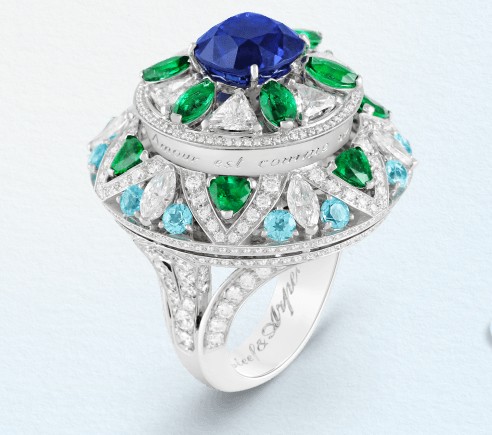 With a quarter-turn, the upper part rises to expose a quote from Oscar Wilde: “Une vie sans amour est comme un jardin sans soleil.” (A life without love is like a sunless garden). The ring features white gold, diamonds, emeralds, Paraíba-like tourmalines, a cushion-cut sapphire of 5.13 carats (Burma).