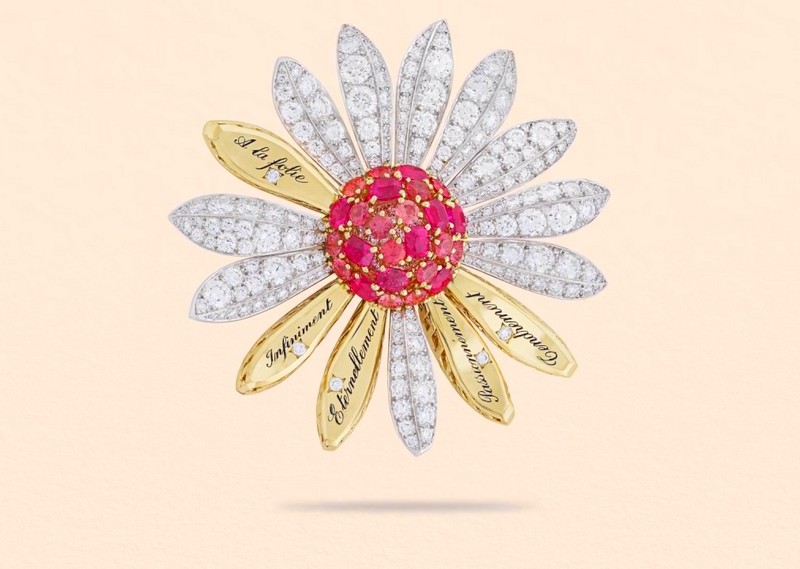 The Maison pays tribute to the well-known game, in which the player picks the petals off a daisy to discover the true feelings of their beloved. An invisible mechanism rotates the yellow-gold petals to reveal engraved messages. Each message is accompanied by a lucky diamond in star setting.