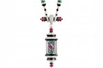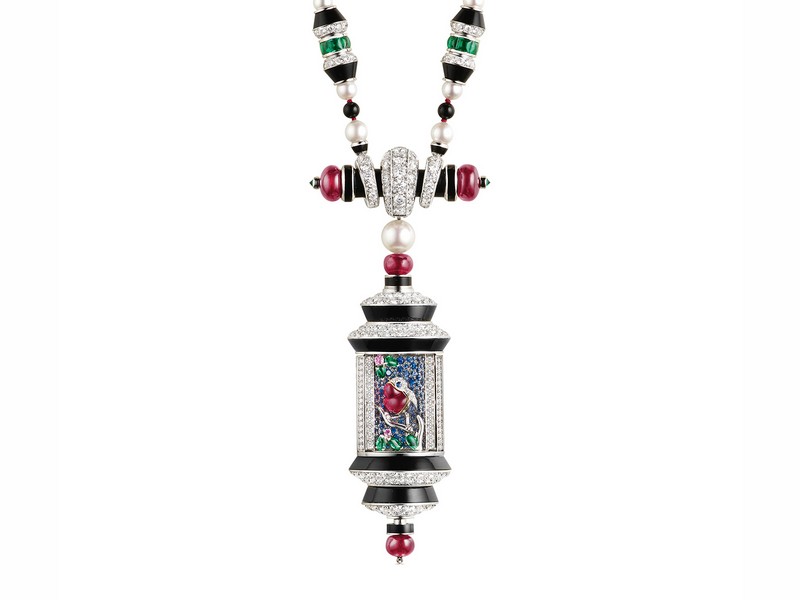 This transformable long necklace shelters a bird nestling at its heart, artfully hidden in the central jewelry motif. A diamond door slides open to reveal a carved nightingale against a background of sapphires and buff-topped emeralds. The necklace may be worn in three different ways, one long and two short, illustrating the art of metamorphosis.