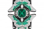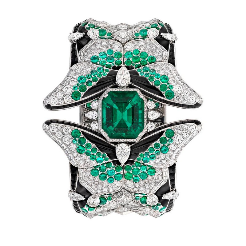 Butterflies enjoy a game of hide and seek. One of them hides a mother-of-pearl dial that can be revealed with the fingertips. The hour is read like a secret, in a swarm of emeralds, black spinels and diamonds. At the center, discover an exceptional Colombian emerald.