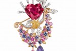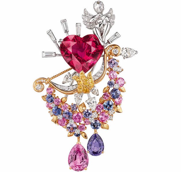 Cupid, the well-known god of love from Roman mythology, invites the spectator to share a secret with a gesture meaning “shh!”. He appears here surrounded by his traditional symbols, perched on a heart-shaped rubellite of a pinkish purple hue. Intended to plant the seeds of love in the hearts of men and women, the bow – crafted from a twisted thread of gold – supports an opulent garland of pink and mauve sapphires, while the arrows are punctuated by pear-shaped and baguette-cut diamonds.