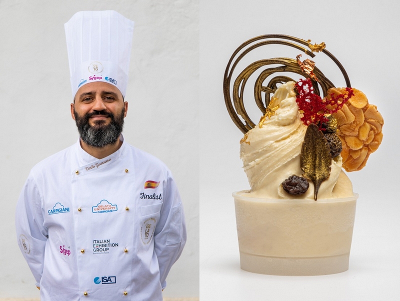 In second place overall, from Spain, Carlo Guerriero of La Cremeria Gelato Italiano in Cádiz with the flavor “Cremoso al Vino Oloroso²”. A captivating zabaglione gelato flavored with Palo Cortado sherry wine, raisins soaked in the same wine and crunchy almonds.
