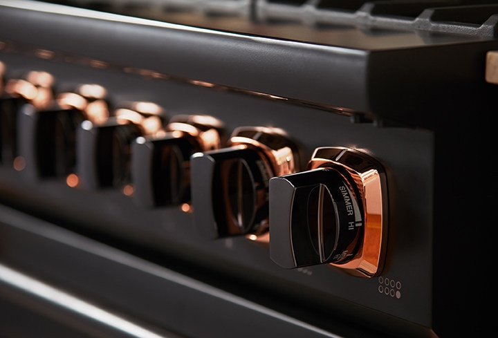 Elevation Burners that efficiently deliver heat to any size cookware; VariSimmer Setting that provides gentle, even simmering; SureSpark Ignition System ensuring automatic ignition/reignition; GentleClose Door for dampened closing; Black Chrome Knobs with CoolLit LED backlighting to highlight the Rose Gold.
