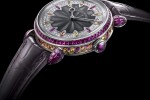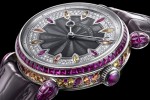 The dial is a prowess of micro-machining with 12 indexes in navette cut rubies, orange and yellow sapphires set from below, circled by 84 diamonds in a paved setting with an engine-turned and grey enamelled central rosace. The crown is set with a closed ruby cabochon. The buckle mirrors the sides of the middle part with 101 sapphires and rubies of varying sizes and diameters.