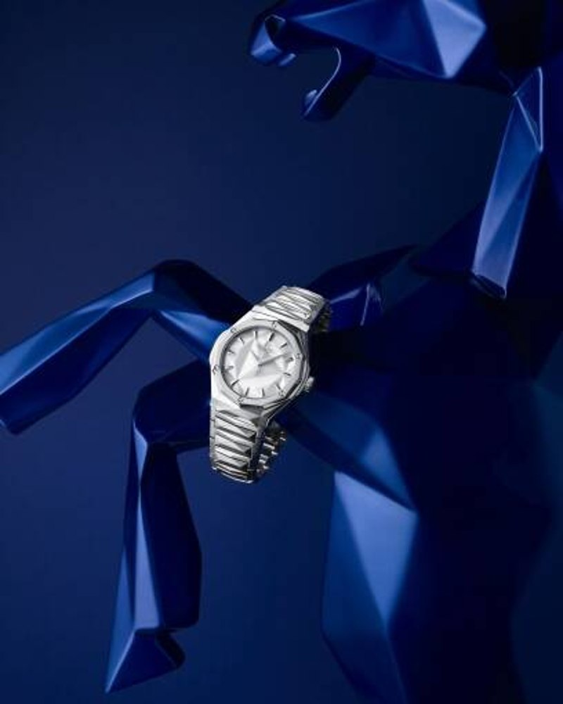 Five years after first collaborating with Richard Orlinski, Hublot has unveiled new versions of the Classic Fusion Orlinski Bracelet. Fitted with a new integrated metallic bracelet, the watches display the angular style emblematic of the French sculptor’s work. Hublot engineers have demonstrated their deep technical expertise in crafting a bracelet whose architecture is beveled and faceted in titanium and composed of 83 parts. The H-shaped links recall the Hublot logo. The 40 mm case in polished titanium encloses a HUB1100 movement, a self-winding calibre with a power reserve of 42 hours. A partially pave set version is adorned with diamonds totaling a weight of 3.79 carats, making the watch a jeweled piece of art.