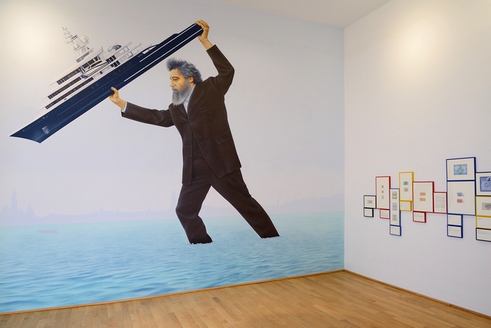 Entitled We Sit Starving Amidst Our Gold, the exhibition is anchored by a mural of Victorian designer and socialist politician William Morris as a giant mythological superhero throwing tycoon Roman Abramovich‘s yacht into the sea. Abramovich along with the other Oligarchs are major players in the art world and are among the wealthiest residents in the UK. The illicit sources of their wealth are underscored by the larger-than-life presentation of The Wende Museum’s newest collection.