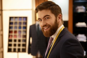Portrait of cheerful man in suit in cloakroom Portrait of cheerful bearded man in blue suit in cloakroom