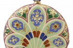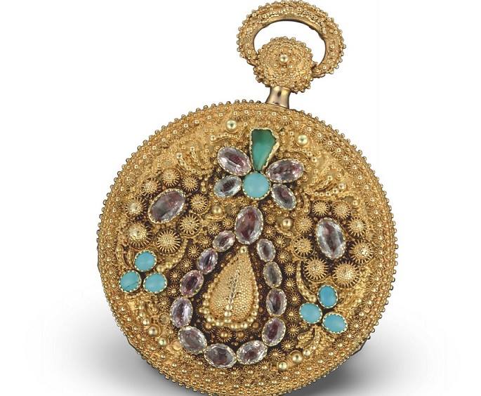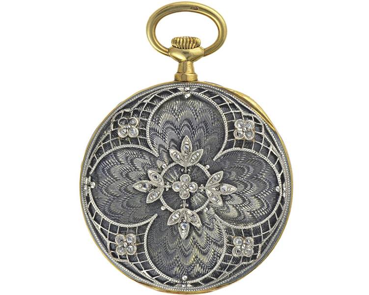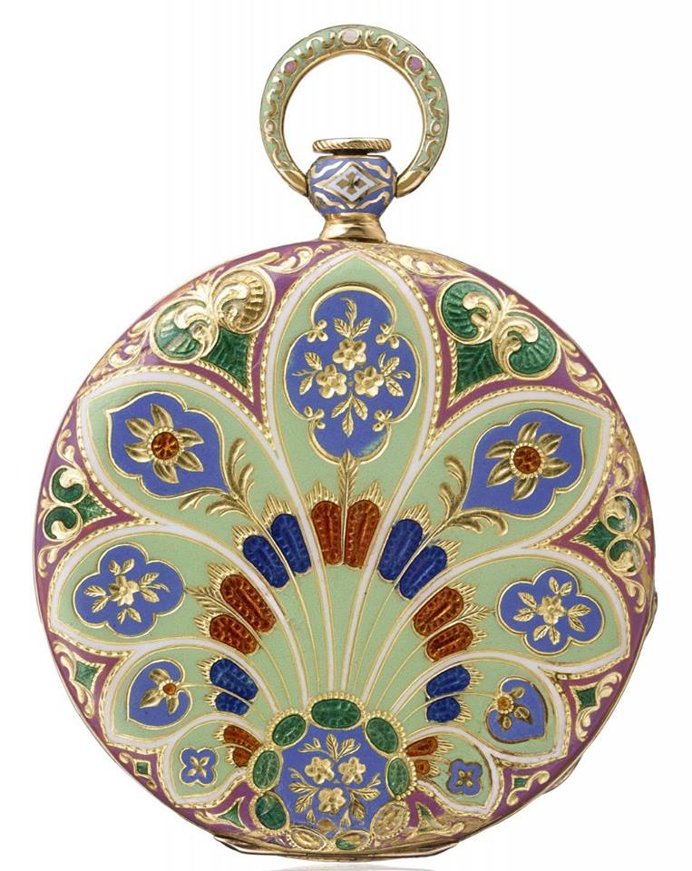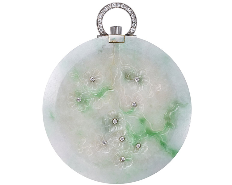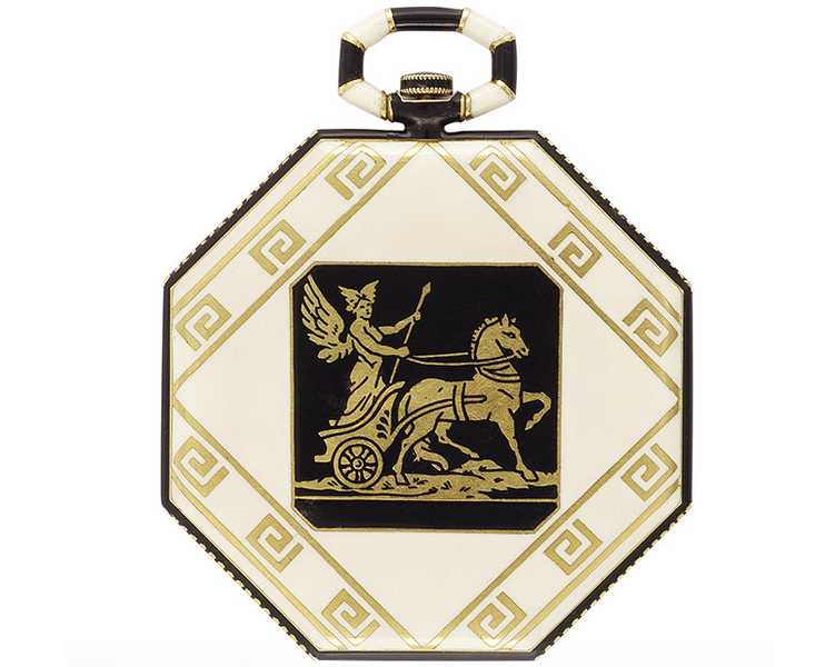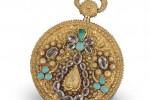 The visit begins in the East, with India and a delicate champlevé enamel pocket watch dating from 1831. A little further on, one discovers the splendours of Ottoman decors with an 1824 pocket watch featuring a case richly adorned with an exuberantly chased floral motif enhanced with appliques engraved using the pounced ornament technique and embellished with turquoises and amethysts – composing a dense yet subtle ornamentation. Still in Asia, blossoming cherry tree spreads its branches across a very light green jade case studded with a few diamonds. Art Deco was a momentous period with its two-tone colouring, its geometrical shapes, its baguette-cut precious stones or its semi-precious onyx, lapis lazuli and coral.