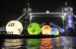 Undated handout photo issued by the National Lottery of giant 26 foot Lotto balls floating down the Thames to celebrate new Lotto which launches this Saturday October 5th with a £10m jackpot and 1,000 guaranteed winners of £20k. PRESS ASSOCIATION Photo. Issue date: Wednesday October 2, 2013. Equivalent to the height of two double decker buses, the balls set sail from Londonís Docklands into the heart of the City, passing under the iconic Tower Bridge. See PA story LOTTERY Balls. Photo credit should read: Oliver Dixon/National Lottery /PA Wire