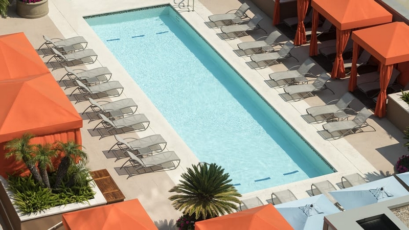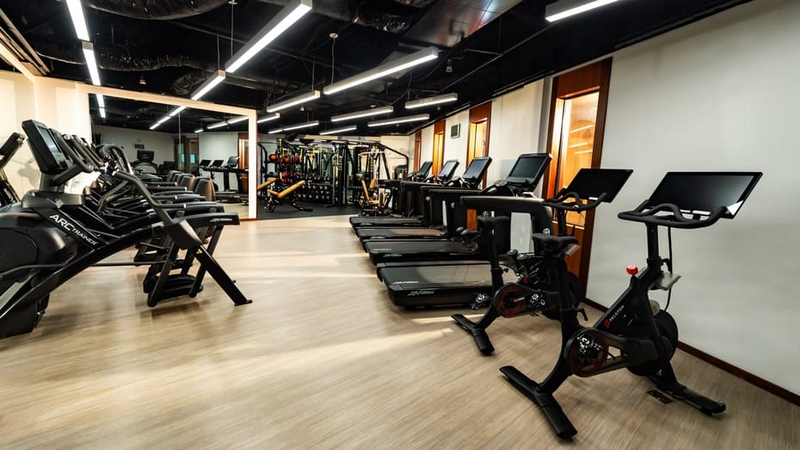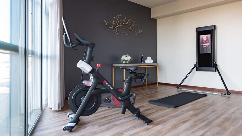 The high-end hotel’s boutique gym experience is complemented with the Private Fitness Suite complete with a Tonal, cardio machine and weights; and the Outdoor Fitness Cabana, located by the sunlit rooftop pool, and equipped with a Peloton, row and elliptical machines, and free weights.