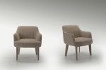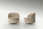 Embellished by an elegant diamond pattern on the inner part, the seat back embraces the soft, deep seat with circular profile. Upholstered with leather or cloth, it is completed by a steel base with swivelling mechanism.