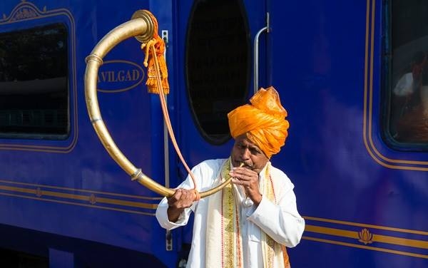 Deccan Odyssey - Meet the Asia's Leading Luxury Train - A trumpeter welcomes Deccan Odyssey visitors to Kolhapur Railway Station