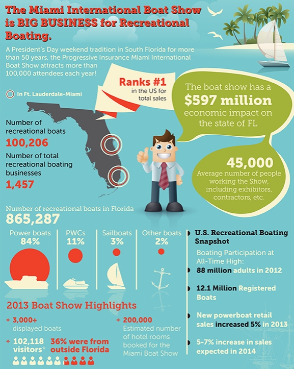 The Progressive Miami International Boat Show, the world’s premier boat show, arrives in the Magic City Feb. 13-17, 2014, bringing more than 3,000 boats and 2,000 companies from across the globe to three locations – Miami Beach Convention Center, Sea Isle Marina & Yachting Center and Miamarina at Bayside – for five days of nautical fun.