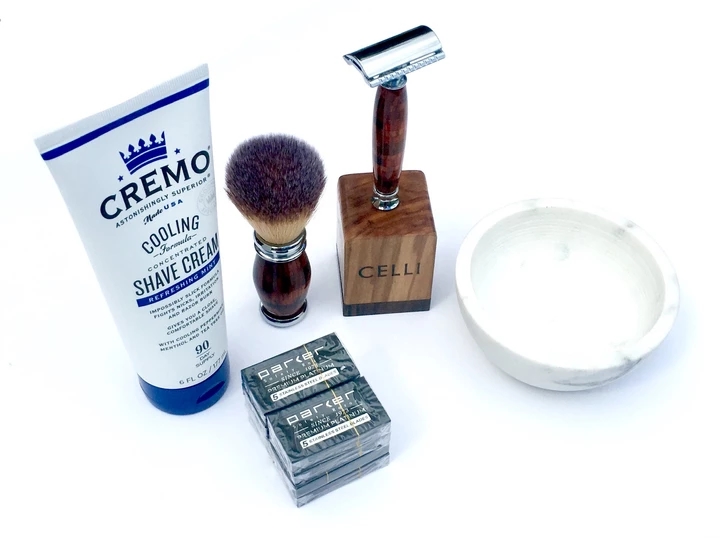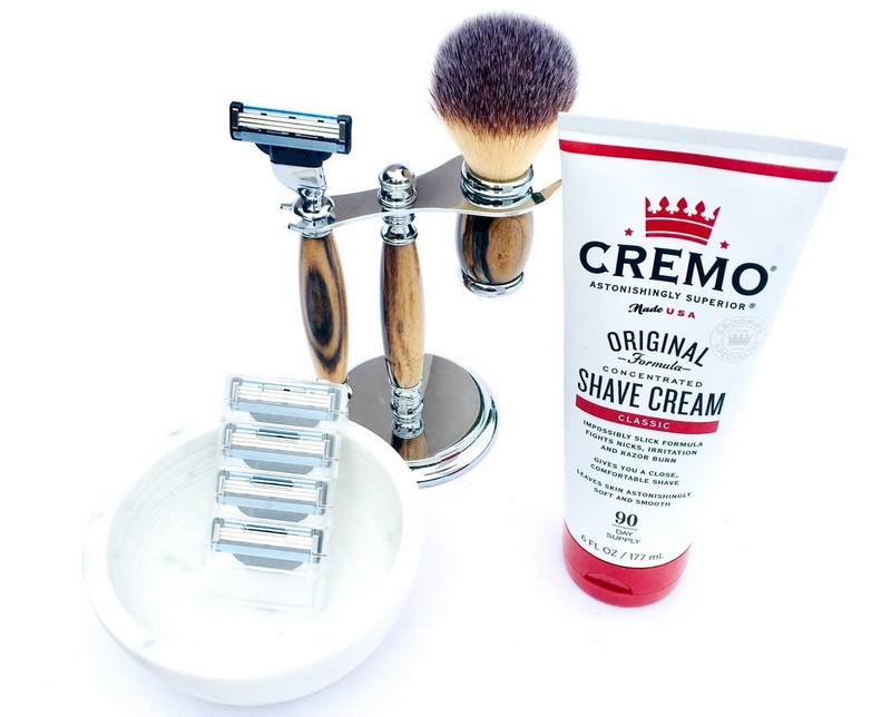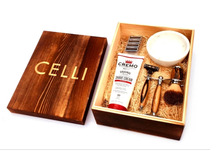 The luxury set also includes a 6 oz. bottle of Cremo Shaving Cream. This very popular shaving cream brand will help you enjoy a clean, comfortable shave with astonishingly smooth skin while fighting razor burn. The entire shaving set arrives in a handcrafted custom-made luxury wooden box. All pieces are handmade in the United States.