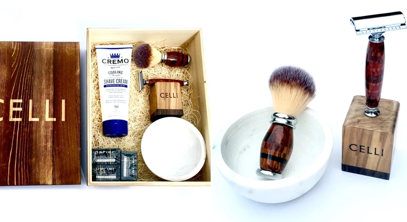 Celli Shave has released a limited edition, handmade razor blade gift set called the /V shaving set ($5,000 USD). This luxury hand-tuned shaver features sustainable black and white ebony wood, capped with chrome fittings. The razor handle works with the popular line of Gillette Mach 3 and Venus blades.